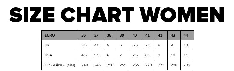 | UK | 3,5 | 4,5 | 5 | 6 | 6,5 | 7,5 | 8 | 9 | 10 | 10,5 | 11,5 | 12,0 | 12,5 | 13,5 | 14,5 |